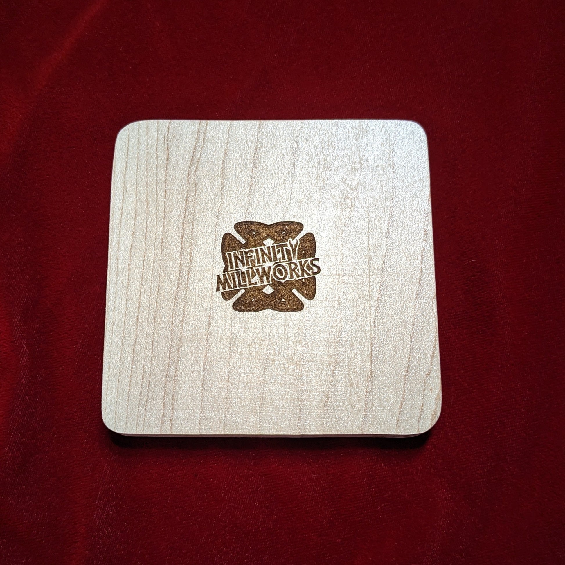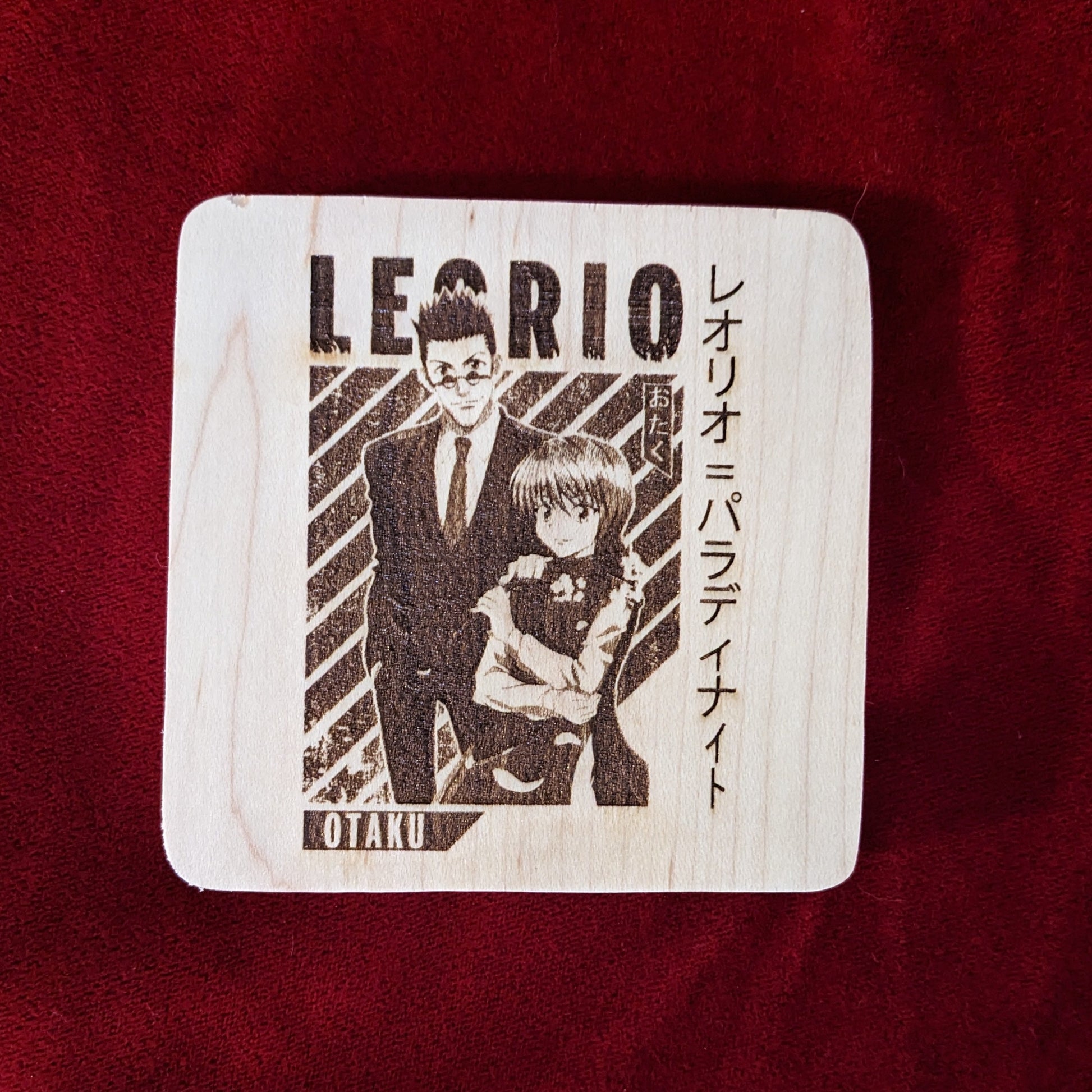 Maple Coaster with Leorio laser etched into it. Coaster is 4" x 4" x 3/8" thick and sealed with 3 coats polyurethane to protect it from moisture.